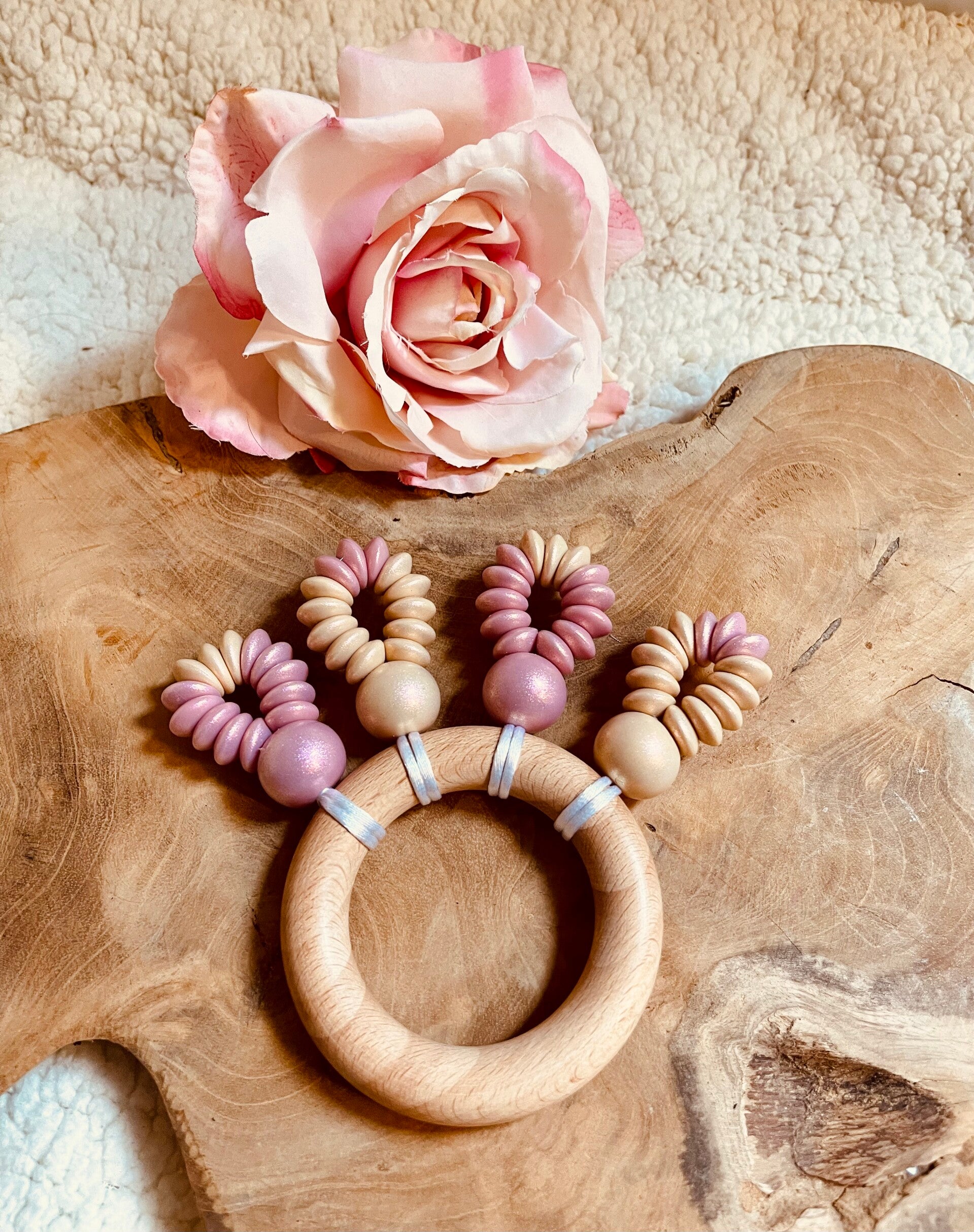Hoe schattig is deze bijtring. Een houten ring met siliconen kralen als Bunny oortjes. De bijtring ligt goed in kleine handjes en is goed voor de doorkomende tandjes. Met deze prachtige kleuren combinatie die echt girly is maakt jullie meisje helemaal de blits !