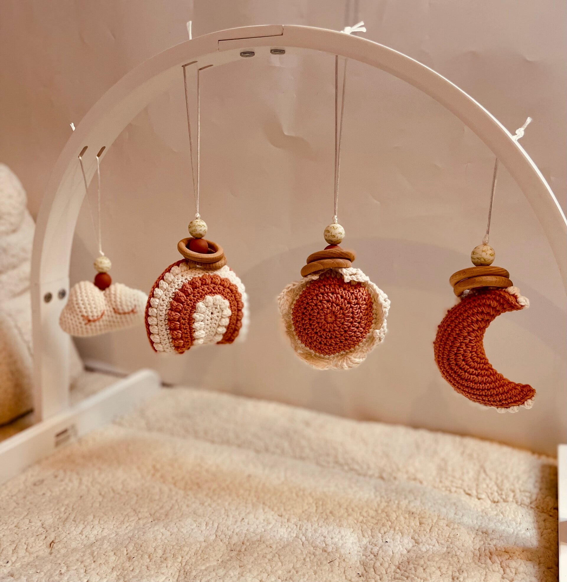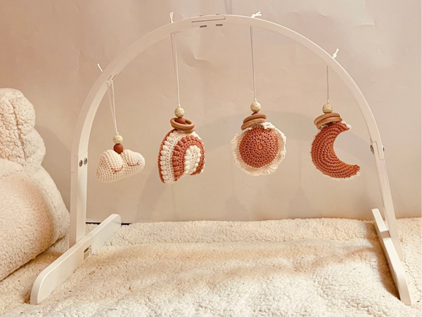 Een stevige houten baby gym in wit om de baby te vermaken. Aan de ronde boog hangen 4 figuurtjes namelijk een Wolkje, Regenboog, Zonnetje en een Maan.