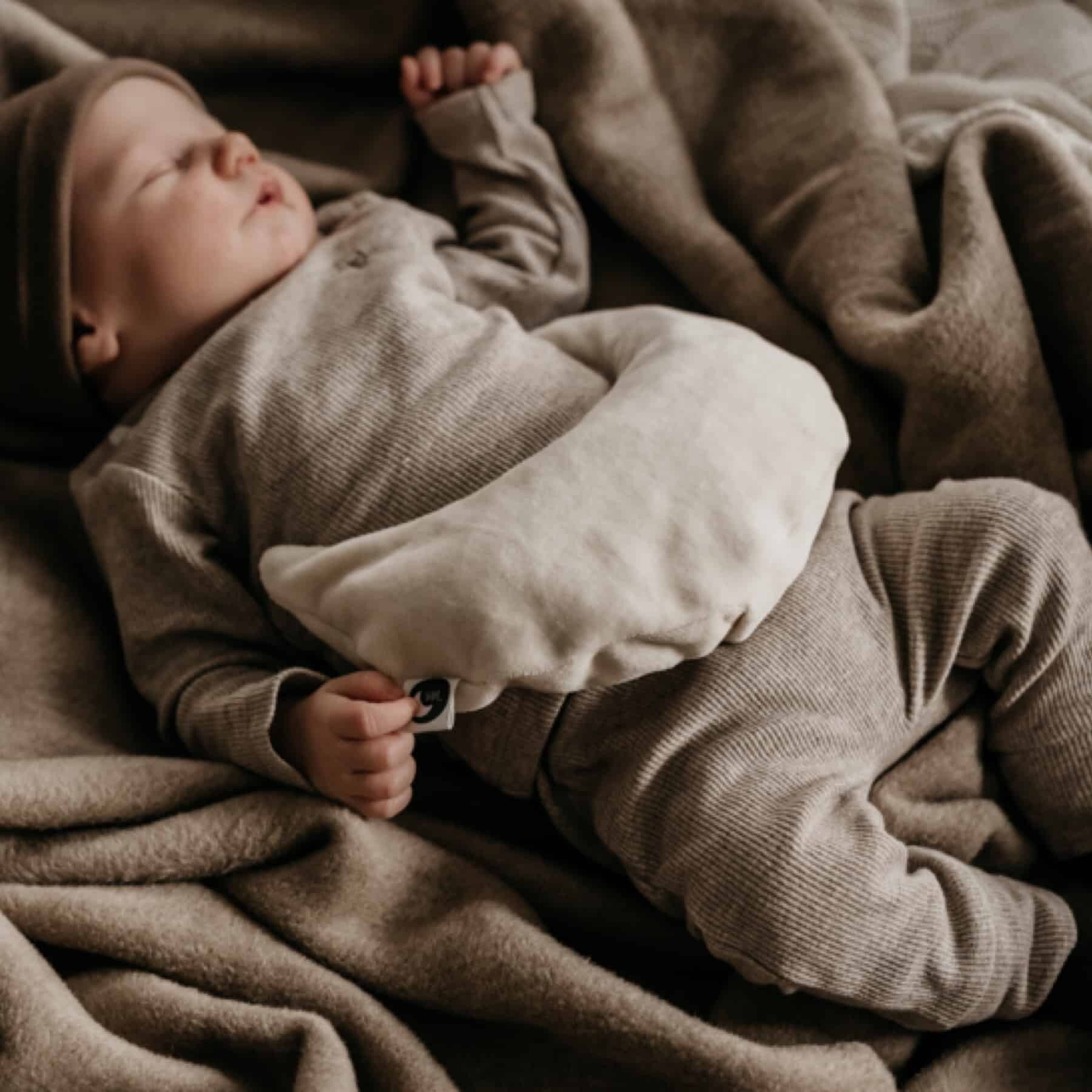 Het maanvormige warmtekussentje bestaat uit een pittenzakje van GOTS-gecertificeerd biologisch katoen met daaromheen een hoes in de kleur of print naar keuze. De hoes in deze velours uitvoering bestaat ook uit GOTS-gecertificeerde katoen.