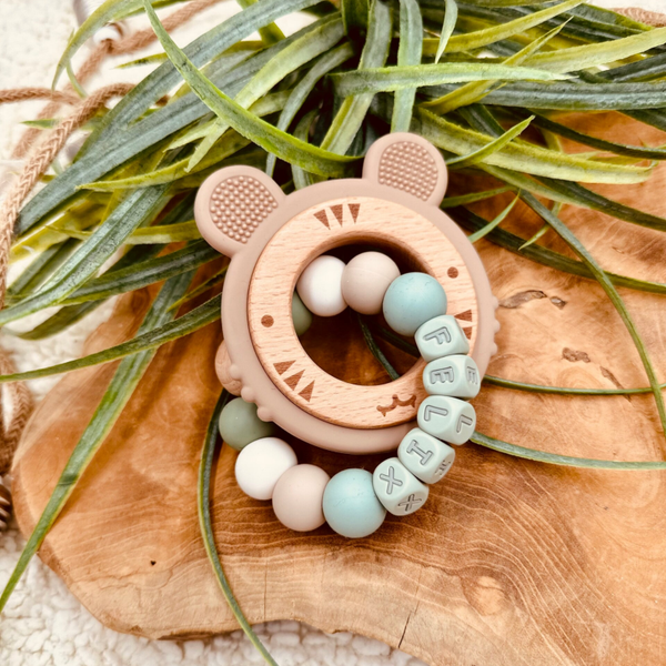 Wil je graag een bijtring met naam dan kan je kiezen uit welk bijtfiguur en in welke kleur je graag de letterkralen wil hebben. Vermeld daarna de naam die aan de bijtring moet komen. Via opmerkingen kunt U vermelden welke kleuren U graag terug ziet komen in de bijtring.