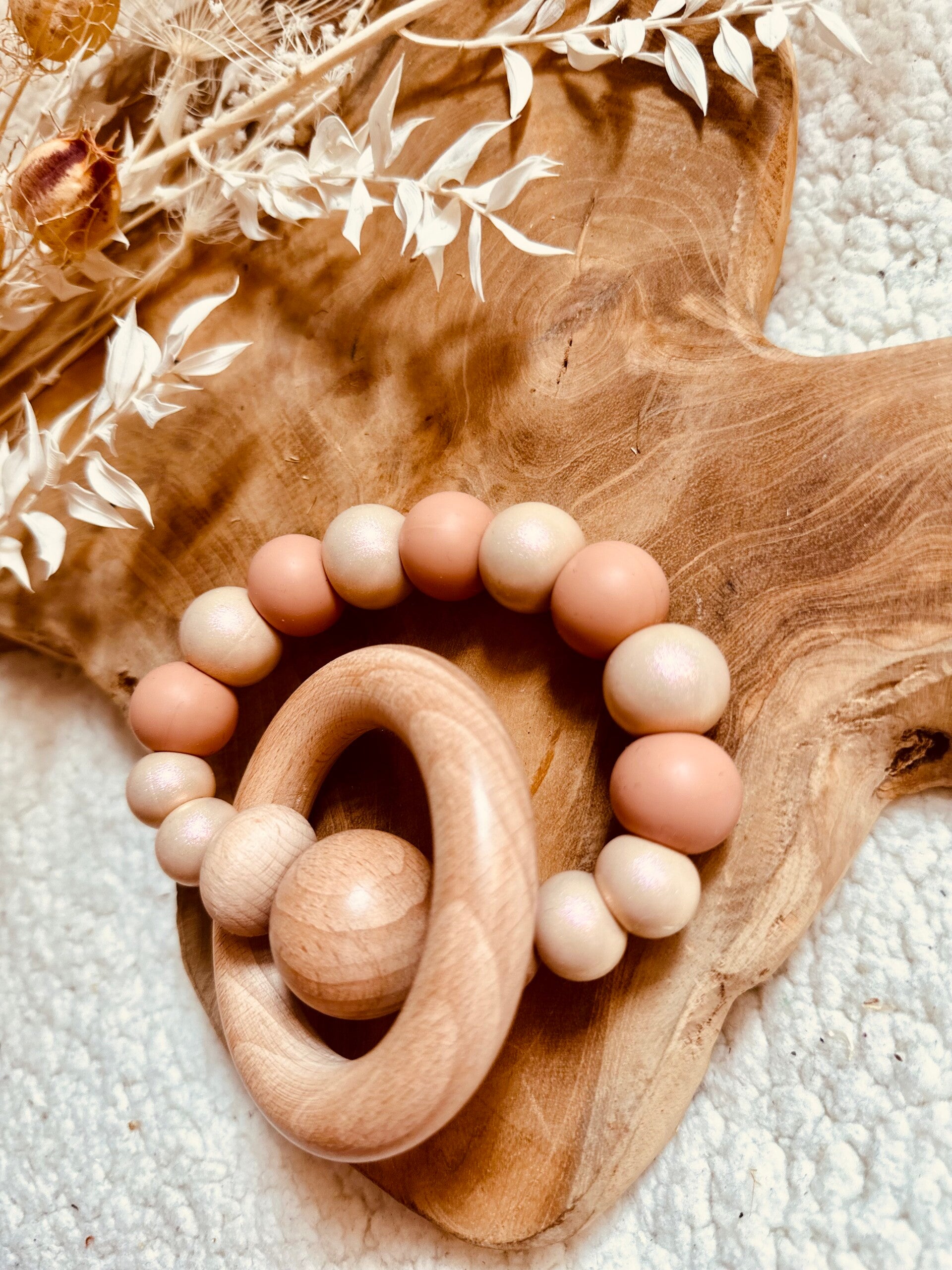 Deze bijtring wekt de interesse van jullie kleintje. Mooie siliconen kralen met een paar hout accenten. Ligt fijn in de kleine handjes. De houten ring verzacht het tandvlees bij doorkomende tandjes.
