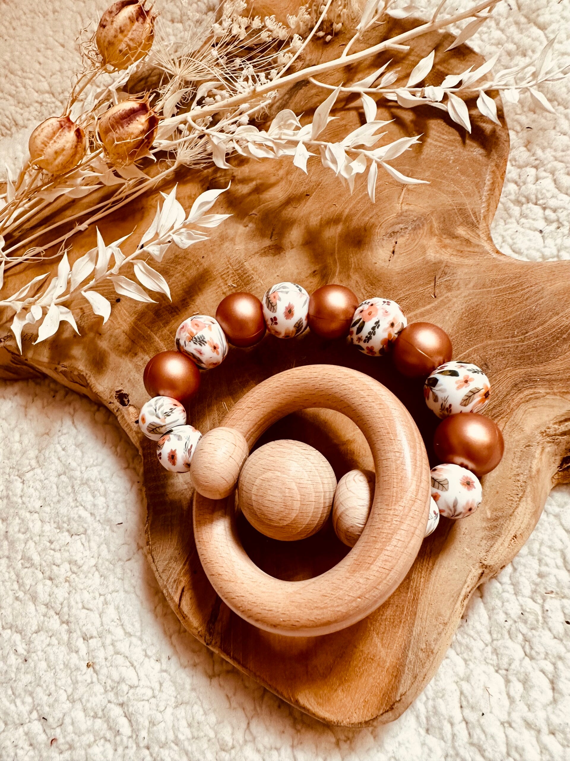 Deze bijtring wekt de interesse van jullie kleintje. Mooie siliconen kralen met een paar hout accenten. Ligt fijn in de kleine handjes. De houten ring verzacht het tandvlees bij doorkomende tandjes.