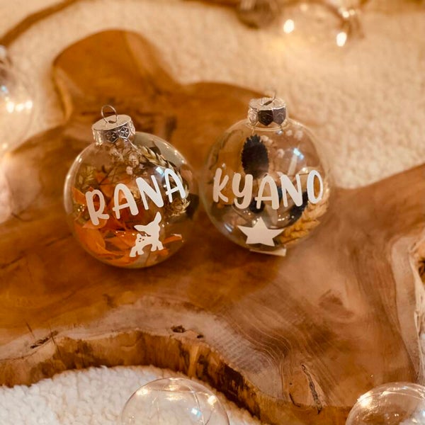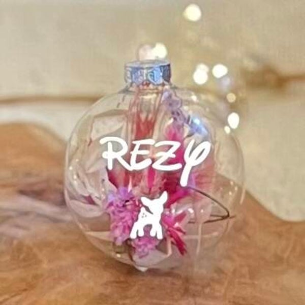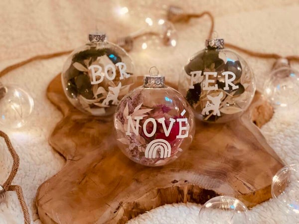 Versier je Kerstboom met deze gepersonaliseerde Kerstbal met prachtige droogbloemen. De kerstbal wordt voorzien van naam en een plaatje. De opdruk is in Goud of Wit.