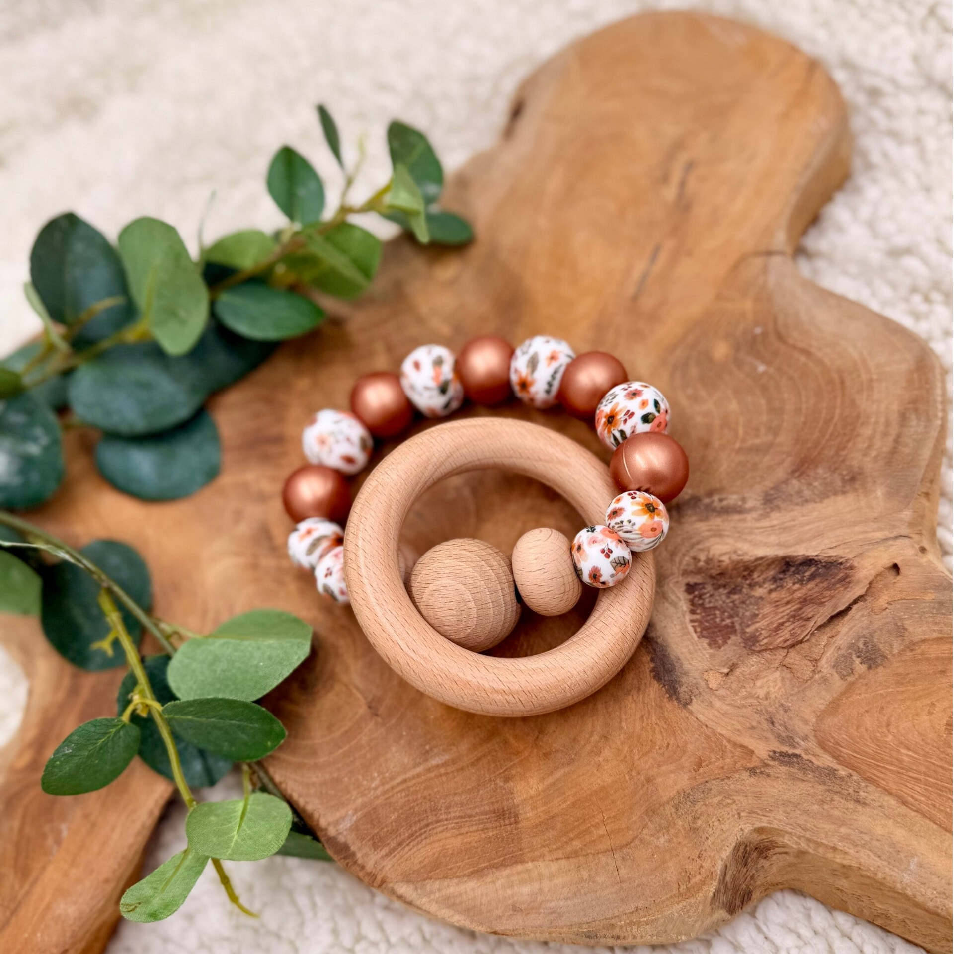 Een prachtige houten bijtring met kralen in warme tinten. Fijn om op te bijten, makkelijk vast te houden en perfect bij doorkomende tandjes.