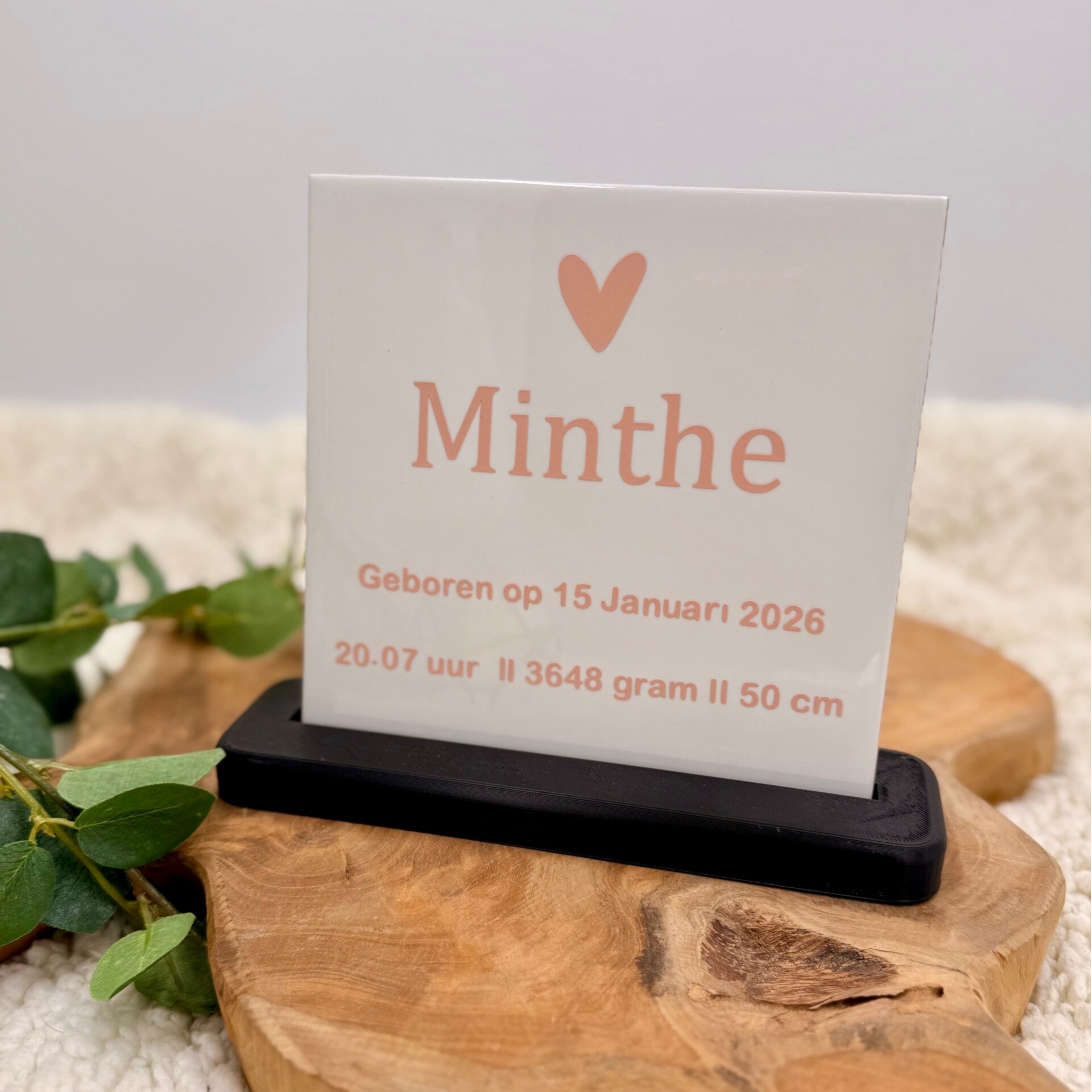 U kunt kiezen uit een tegeltje met alleen tekst zie foto of u kunt het geboortekaartje uploaden als u deze graag ziet op een tegeltje.