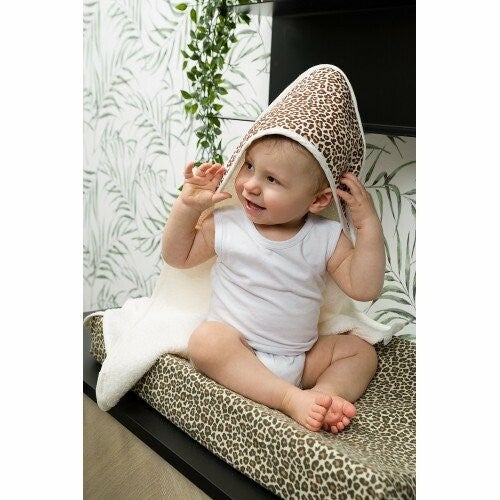 Deze klassieke badcape is gemaakt van heerlijk zachte, comfortabele badstof van Cottonbaby functioneert als een handdoek en houdt je baby warm na het badderen. Dankzij de muts blijft het hoofdje van je baby lekker warm. De muts heeft een klassieke bruine panterprint.