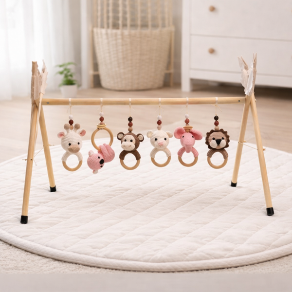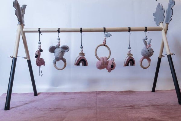 Ben jij op zoek naar een babygym voor tweelingen dan is dit wat je zoekt. Je kunt jouw eigen kleurtjes en figuurtjes helemaal samenstellen zoals jij het wil. Zo maak je de babygym bijvoorbeeld helemaal passend in jouw woonkamer of babykamer. Een babygym met on top veren en 6 figuurtjes naar keuze.