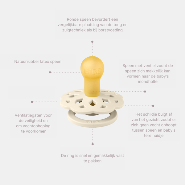 De ronde speen van natuurlijk rubberlatex is ontworpen om te lijken op de vorm en grootte van de zachte tepel van de moeder en bevordert een vergelijkbare plaatsing van de tong en zuigtechniek bij het geven van borstvoeding.