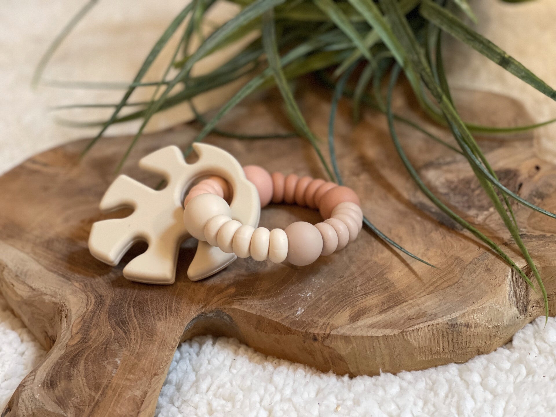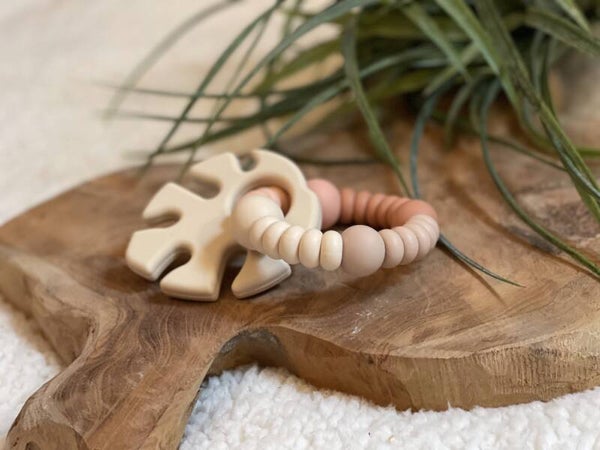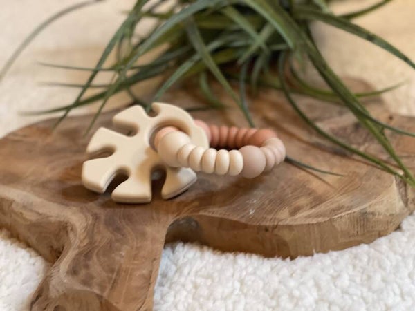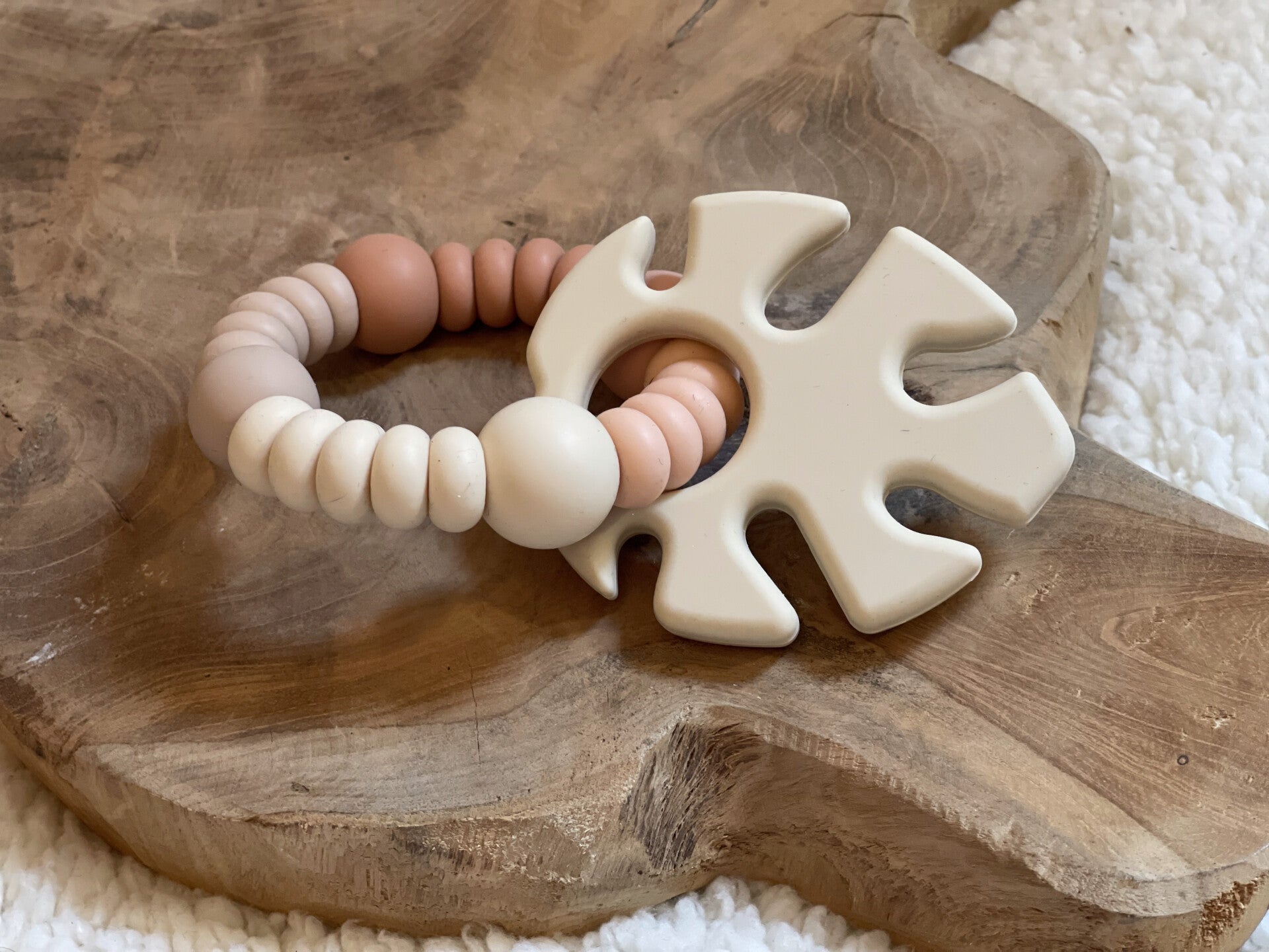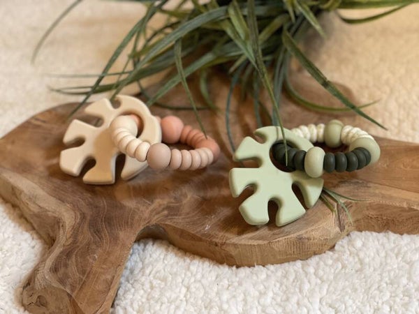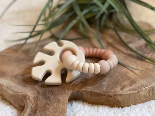 Deze bijtring bevat siliconen kralen en een monsterablad bijtfiguur.