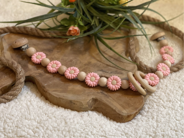 Een prachtige wagenspanner met margrietjes. De wagenspanner wordt bevestigd dmv clips. Aan de wagenspanner hangen 2 houten ringen om het interessant te houden voor jullie kleintjes. Zo kunnen ze geluid maken als ze de wagenspanner aanraken. Goed voor hun oog hand coordinatie .