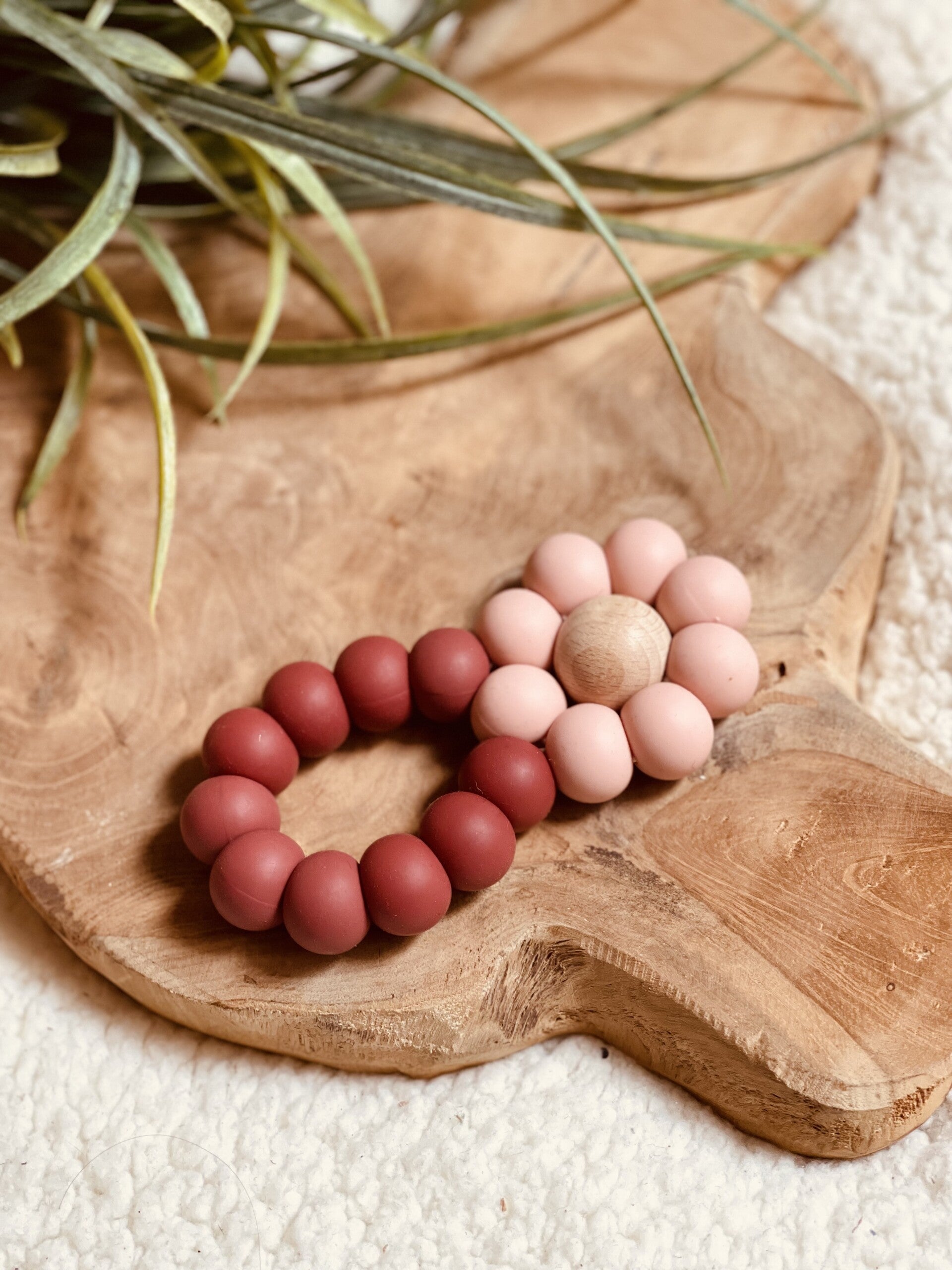 Een prachtig bloempje in de vorm van een bijtring. Handig voor die kleine handjes en enorm schattig.