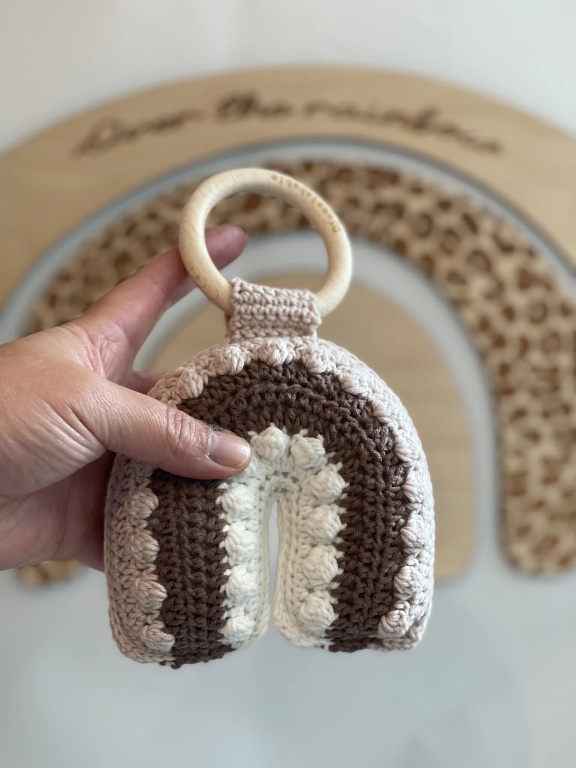Een prachtig gehaakte bijtring Regenboog met ring voor de doorkomende tandjes. Liever andere kleuren gewenst kunt u dit bij opmerkingen noteren.