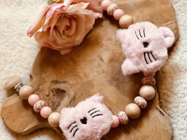 De wagenspanner bestaat uit 2 poesjes met een combinatie van meerdere soorten kralen waaronder hout en siliconen kralen. Deze combinatie zorgt voor een speelse en hippe look. In de poesjes zit een rammelkraal wat een muzikaal effect geeft als de wagenspanner beweegt.